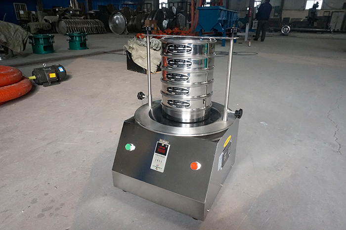 試驗(yàn)篩機(jī)是以YZU立式振動(dòng)電機(jī)作為整機(jī)振動(dòng)源,通過(guò)振動(dòng)電機(jī)帶動(dòng)上部振動(dòng)盤(pán)振動(dòng),再通過(guò)振動(dòng)盤(pán)傳導(dǎo)至安放在振動(dòng)盤(pán)上部Φ200篩框上,然后由需要檢測(cè)目數(shù)的篩框把小于篩網(wǎng)孔徑的物料顆粒篩分至下層篩框,如此層層篩選,使每層試驗(yàn)篩內(nèi)只留相同粒度的物料,達(dá)到不同粒度的分離并確定此物料的粒度組成,使Φ200型篩框中的物料能非常有效的起到過(guò)濾、分級(jí)、篩分目的。